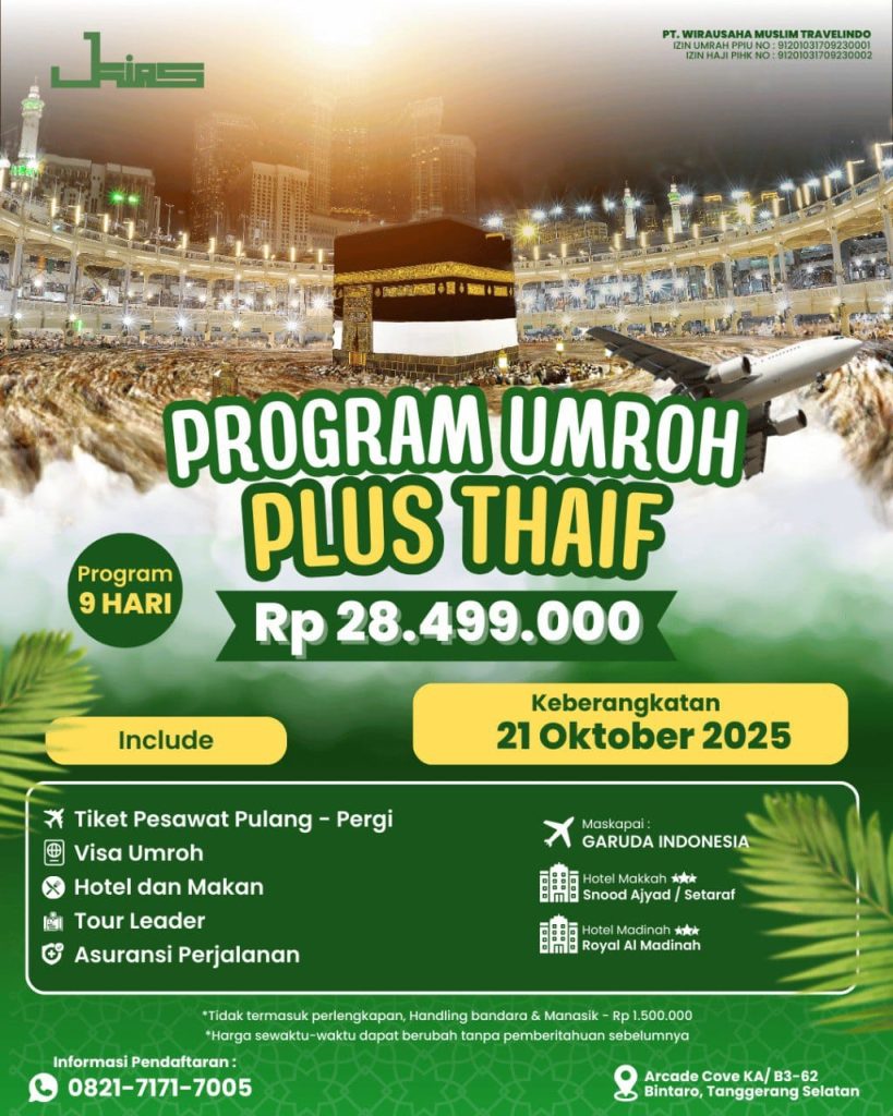 Kias Travel Umroh telah berizin resmi dari Kemenag dan memiliki reputasi positif dari banyak jemaah. Travel Umroh ini menyediakan berbagai Paket Umroh lengkap dan fleksibel, mulai dari paket reguler hingga VIP, dengan harga yang transparan dan pelayanan prima.