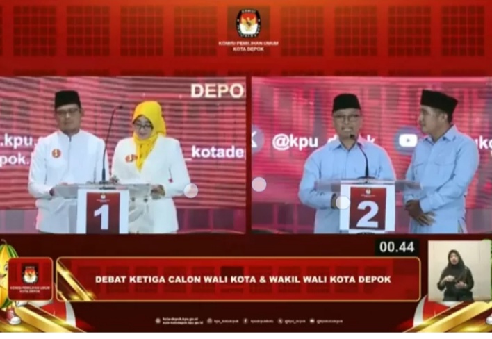 tribundepok.com – Debat ketiga pasangan calon Wali Kota dan Wakil Wali Kota Depok berlangsung dengan penuh dinamika dan tensi politik yang tinggi. Acara yang digelar di Kampus JGU Grand Depok City dan disiarkan secara langsung oleh TVRI,Kamis Malam (21/11/2024) menghadirkan dua pasangan calon, yakni Imam Budi Hartono-Ririn Farabi (nomor urut 1) dan Supian Suri-Candra Rahmansyah (nomor urut 2). Dalam debat ini, kedua paslon saling memaparkan visi dan misi, adu argumen, hingga menyindir satu sama lain dalam balutan persaingan yang sengit.