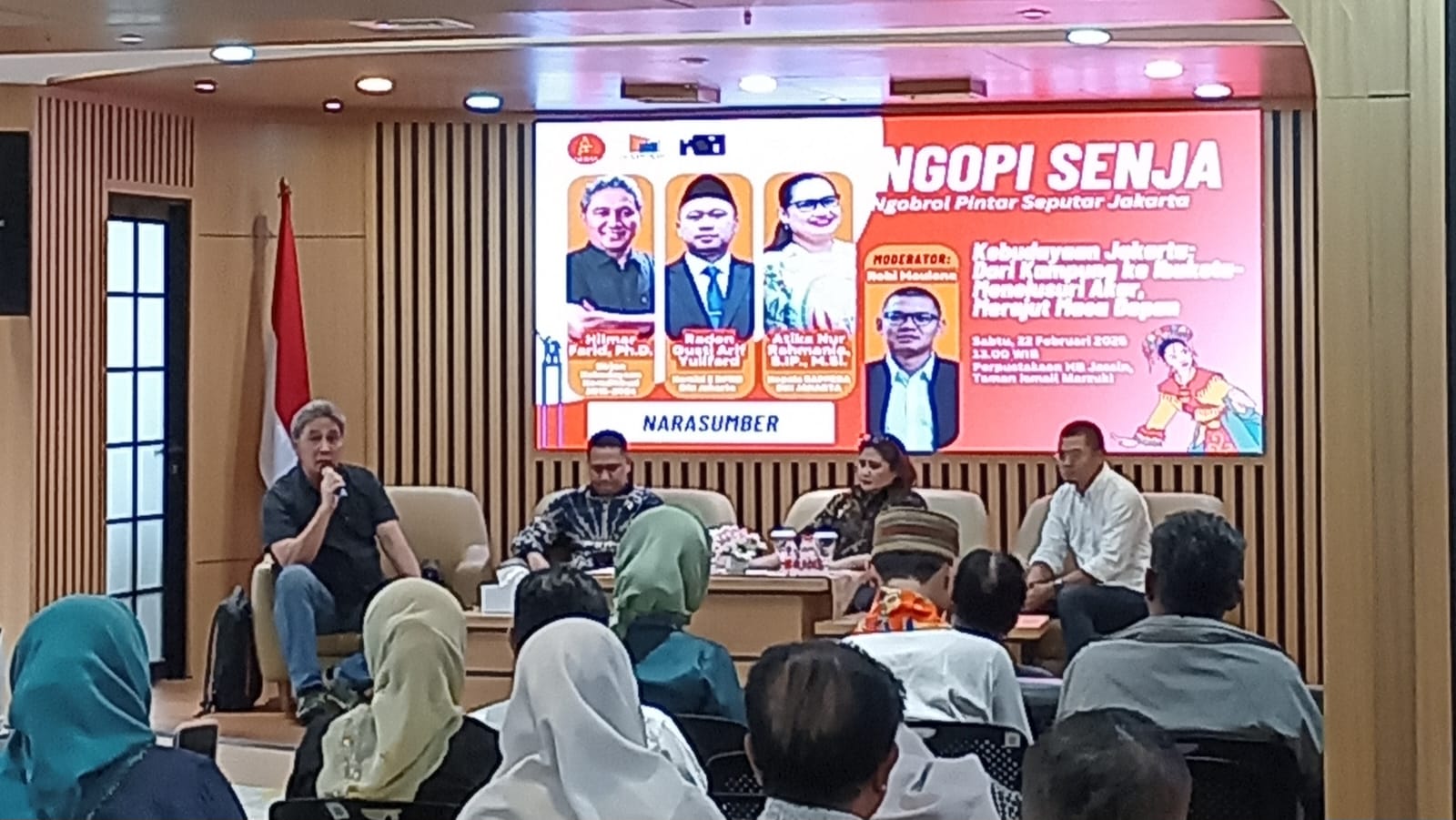 tribundepok.com – Jakarta – Perkumpulan GERAK yang dimotori oleh Ketua Umum Dhini Mudiani kembali menggelar diskusi publik “Ngopi Senja” (Ngobrol Pintar Seputar Jakarta) dengan tema “Kebudayaan Jakarta: Dari Kampung ke Ibukota – Menelusuri Akar, Merajut Masa Depan” pada 22 Februari 2025 di Perpustakaan HB Jassin, Taman Ismail Marzuki. Acara ini menghadirkan para narasumber terkemuka di bidang kebudayaan, yaitu Hilmar Farid, Raden Gusti Arif Yulifard, dan Atika Nur Rahmania, serta dipandu oleh Robi Maulana sebagai moderator.